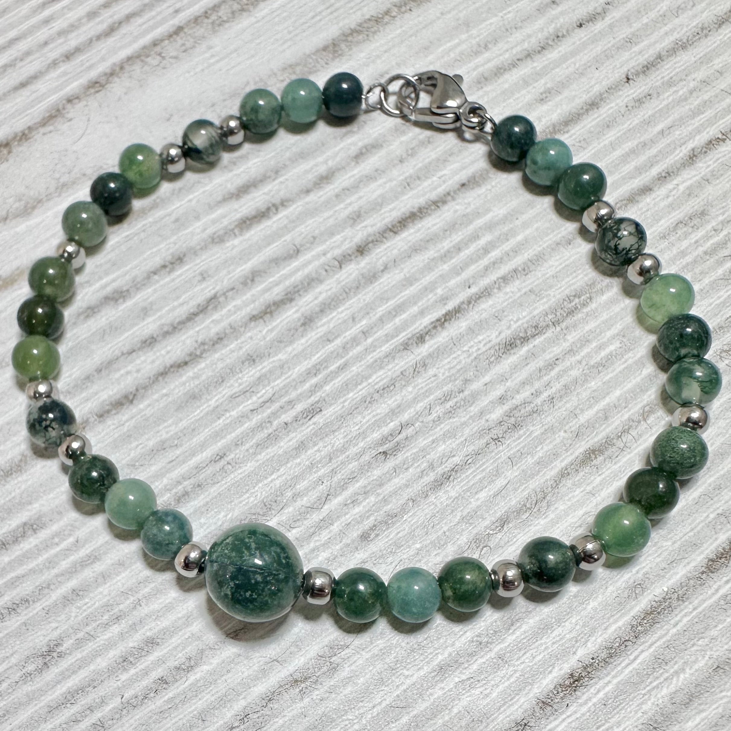 - Billes d'Agate Mousse rondes de 4mm enfilées sur une chaine en acier inoxydable et Une bille d'Agate Arbre 8mm